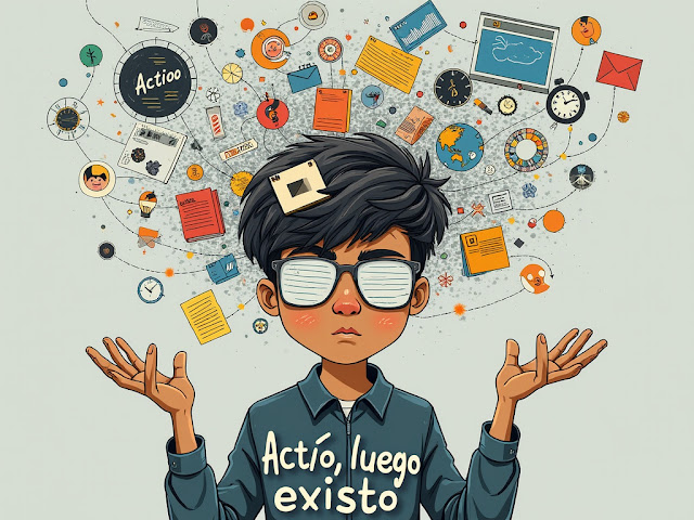 Veamos ahora mi reflexión sobre la Existencia, segundo concepto del apotegma. En mi opinión, nuestra existencia queda evidenciada por los efectos causados por nuestras acciones. Por lo tanto, según esta apreciación, “quien no hace nada, no existe”. De hecho, para hablar con propiedad (en filosofía, los términos todo o nada, así como las afirmaciones o negaciones absolutas no se sostienen) deberíamos matizar: “en el improbable supuesto de que existiese alguien que no ejecutase ninguna acción, nadie se apercibiría de su existencia”. Dada la obviedad de nuestra existencia (en mi caso, como mínimo manifestada por la escritura de este artículo, el cual espero que lea alguien) resulta indudable que estamos constantemente ejecutando actividades, cuyos efectos sobre nuestro entorno y sobre nuestra persona son los que dan sentido al Yo. Esta conclusión es la que me lleva a afirmar: "Actúo, luego existo". Si yo, como sujeto consciente, no percibo efecto alguno del entorno, no existo. Esto es perfectamente comprensible. La conciencia, el ser consciente, siempre se debe referir a algo. No es posible ser consciente de nada. En este caso, no es posible la existencia.